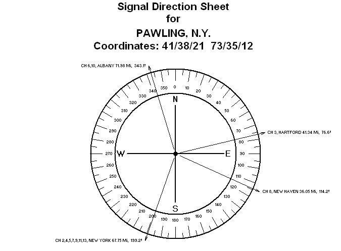 The Signal Direction Sheet, presented on the center of the first page, developed for the Pawling, NY antenna site, displays all UHF stations within 75 miles. The number of UHF stations more than doubled those dis-played on the VHF Signal Direction Sheet above.