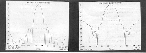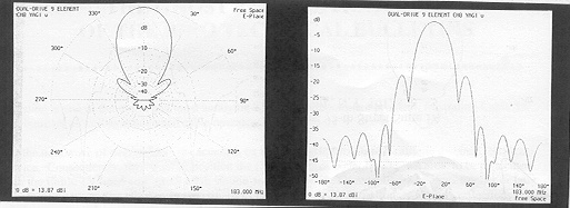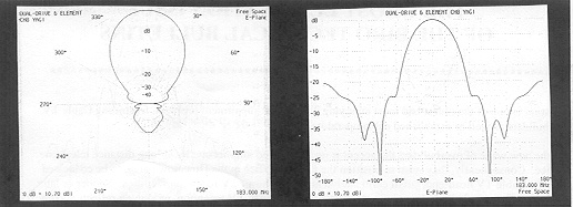 The pictures above show the polar and rectangular radiation patterns of a 9 element, dual-drive Channel 8 Yagi, exhibiting a narrower main lobe, accompanied by 17 dB down first side lobes, and dramatically im-proved Front/Back ratio.