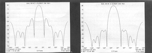 Turning to the graphs below, the left plot shows the results of the two-bay, horizontally stacked array of 9 element Yagis, with H = 0.72l spacing.