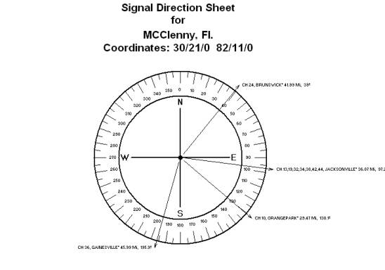 with 55 mile radius printout of all analog and digital TV stations, listing computer calculated distances