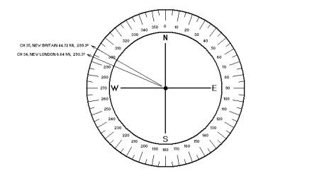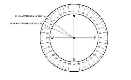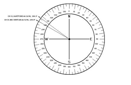 At noon, local Channel 34, New London, a medium power transmitter started operations. The New London station’s direction is 13º off the desired Channel 33, as shown on the signal direction sheet below.