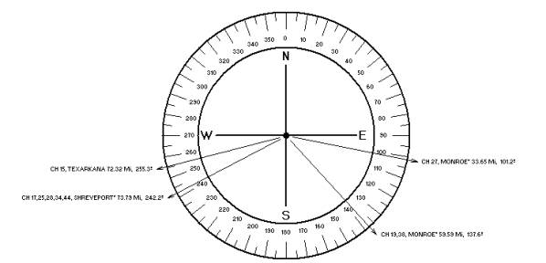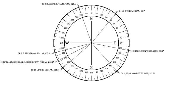 The El Dorado, Arkansas computer run, shown below, displays all analog and DTV stations within 75 miles of the proposed site.