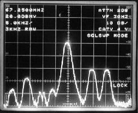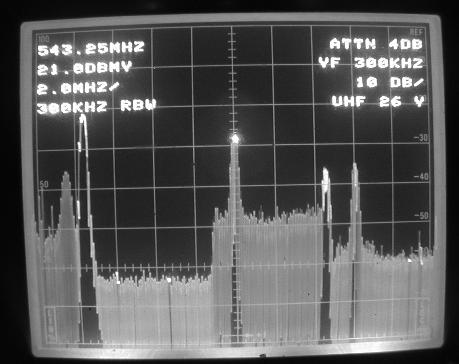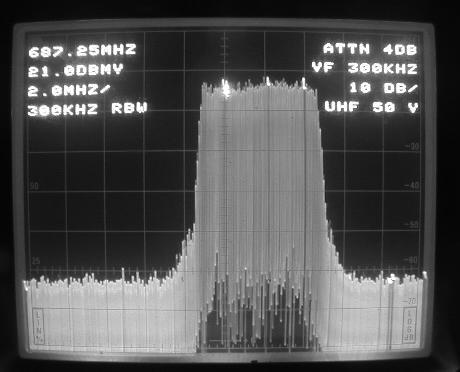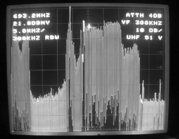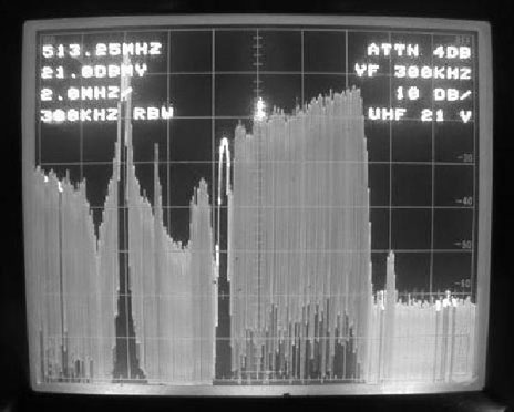 Adjacent channel interference is also a frequently occurring event in the extremely crowded UHF frequency range. The heavy Channel 51 adjacent channel interference, displayed on the photograph below, could not have been detected and evaluated by a Signal Level Meter.