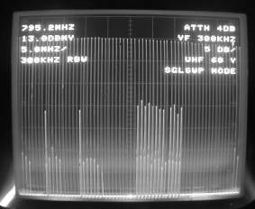 The minimum signal intensity requirement, which is -45 dBm for UHF channels, is the signal level at the antenna input terminals.  On the other hand, the signal level measurements were performed at the end of the antenna downlead.  Consequently, to re-calculate the measured video carrier to the antenna input the insertion loss of the cable has to be measured precisely.  Testing, with the aid of the UHF sweep generator and the TEKTRONIX Model 2710 spectrum analyzer as the measuring instrument, is convenient and a highly efficient method.